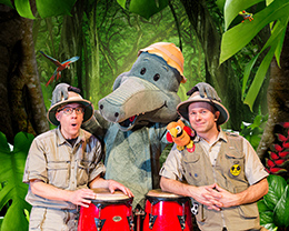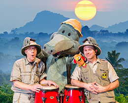 Arne Alligator & Djungeltrumman består av två safariklädda herrar: Tomas Nyberg, Macke Granberg och Arne Alligator. De skriver låtarna själva och producerar dem i Mackes Alligator-studio. På scenen gör Arne Alligator & Djungeltrumman en intensiv och humoristisk show där Tomas sjunger, Macke rockar på gitarren och Arne Alligator hittar på hyss och spelar på sina röda kongas. Ibland spökar det på scenen. Ibland så ryker det ur skorsten så man måste ringa Torsten med Borsten. Ibland pratar de bara strunt. På konserterna får man alltid sjunga med, klappa och dansa. Orkestern uppträder i tre- eller sexpersoners uppsättning.
